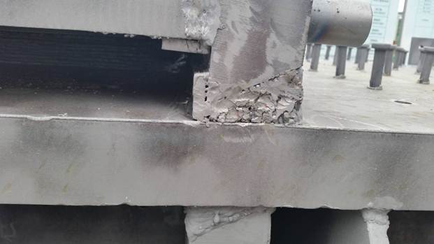 圖6;經檢查進入現(xiàn)場的桁架邊柱支撐節(jié)點由于未加引弧板,造成焊縫端部形成坡度虧肉,后經補焊填平造成的未融合俗稱假焊缺陷,經局部反修處理達到合格。