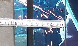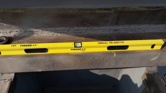 圖8;對已安裝就位完的鋼桁架下眩桿件斷面為1.8M*0.9M雙腹H型鋼,進行焊接前的水平、測彎、起拱進行時測試量,1.8M梁寬水平尺觀測照片,數(shù)值符合規(guī)范標準具備焊接條件。