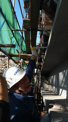 圖13;監(jiān)理人員對安裝的鋼桁架經施工單位自檢合格后,進行垂直度檢查工作。