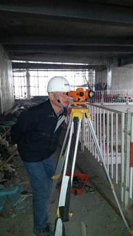 圖14;監(jiān)理人員對安裝的鋼桁架經施工單位自檢合格后,進行桁架中柱部位垂直度檢查工作。